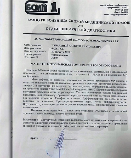 "Структурных изменений мозга не выявлено" — заключение врача после МРТ Алексея Навального. Отека мозга, о котором ранее писали в СМИ, не обнаружено, в заключении упоминается лишь умеренный отек слизистой. Состояние Навального по прежнему остается стабильно тяжелым, он прибывает в коме.