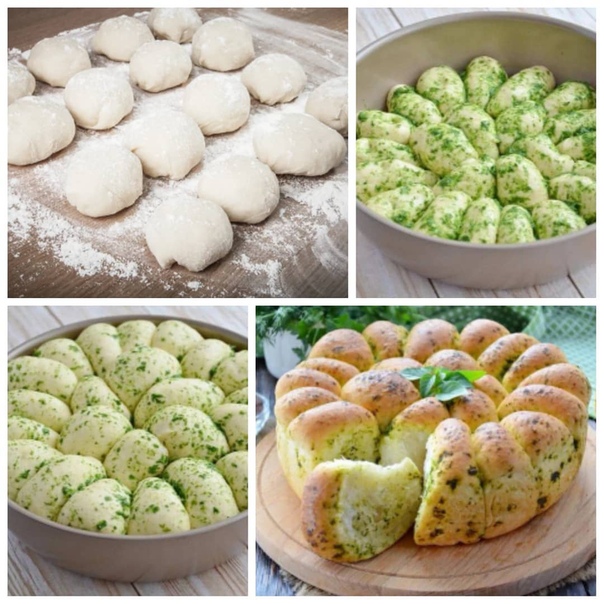 Готовим дома. Пампушки с чесноком и зеленью. Ингредиенты: -Пшеничная мука - 500 г -Прессованные дрожжи - 20 г Показать полностью…-Соль - 0.5 ч.л. -Сахар - 1 ч.л. -Растительное масло - 50 мл -Теплая вода - 300 мл -Зелень - 1 небольшой пучок -Чеснок - 2-3 зубчика -Сливочное масло - 10 г Приготовление: 1. Смешиваем просеянную муку (200 г) с дрожжами, теплой водой и сахаром. Накрываем крышкой и оставляем на 30-40 минут. 2. Добавляем масло и соль. Затем постепенно добавляем оставшуюся просеянную муку. Замешиваем тесто в течении 10-15 минут. Тесто должно получиться мягким и податливым. 3.Готовое тесто скатываем в шар и накрываем кухонным полотенцем. Оставляем в теплом месте. 4. Когда тесто увеличится в 2 раза, выкладываем его на рабочую поверхность, формируем один шар. Форму для выпекания хорошо смазываем сливочным маслом. 5. Готовое тесто делим на 2 части из каждой раскатываем прямоугольник, сворачиваем в рулет и отрезаем по небольшому кусочку. 6. Обмакиваем каждую булочку в смесь из рубленной зелени, чеснока и растительного масла. 7. Выкладываем булочки в подготовленную форму. 8. Накрываем форму с тестом пищевой пленкой и оставляем на расстойку на 60-90 минут. 9. Затем ставим в разогретый до 210 С духовой шкаф примерно на 30 минут, до готовности и аппетитной золотистой корочки на поверхности пампушек. Даем пампушкам немного остыть в форме, затем достаем их и подаем к столу. Приятного аппетита.